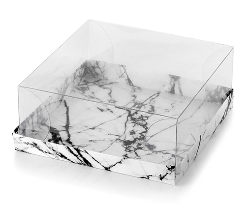 אריזת עוגה  העשויה קרטון בדוגמא של שיש שחור לבן ומכסה שקוף וקשיח.