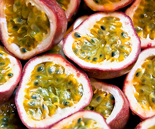 הפסיפלורה, פרי טרופי בעל טעם חמוץ מתוק. הקוביות הקפואות מכילות ציפת פרי ואת הגרעינים השחורים של הפסיפלורה.