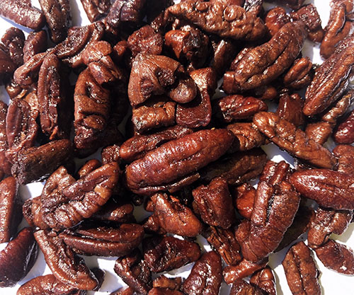 שברי פקאן מסוכרים עשויים מאגוזי פקאן שבורים, סוכר ושמן סויה.